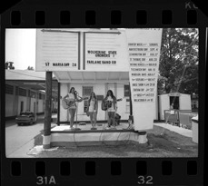 View of three women singing on small stage, two playing guitars and one holding tambourine, at Bob-Lo Amusement Park. Sign advertising special days and events at amusement park in foreground.
