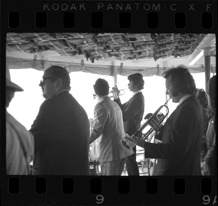 View of two musicians with trumpets on the deck of ferry en route to Bob-Lo Amusement Park and Bob-Lo Island. Life jackets stored on ceiling.