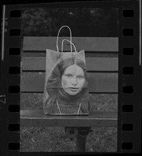 View of shopping bag on park bench at Bob-Lo Island. Shopping bag is printed with portrait of young woman.