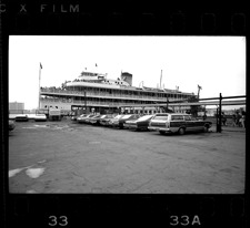 View of passengers on the Bob-Lo ferry "Ste. Claire," docked next to shore. Automobiles in parking lot in foreground.
