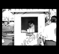 View of employee in ticket booth for ride at Bob-Lo Amusement Park.