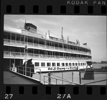 View of the Bob-Lo ferry docked next to shore. "Bob-Lo Company, a Browning Line" painted on side of ferry.