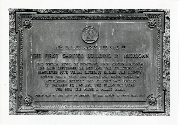 View of bronze tablet marking the site of the first Capitol Building in Michigan and located in Capitol Park at Griswold and State Avenues. Inscription reads: "This tablet marks the site of the first Capitol Building in Michigan. The corner stone of Michigan's first Capitol Building was laid September 22, 1823 and the structure was completed five years later, it housed the county courts for a time and later was given over to legislative sesssions. The building was burned on January 27, 1893, and the following year the site was made a public park. Presented to the city of Detroit in the month of September, 1926."