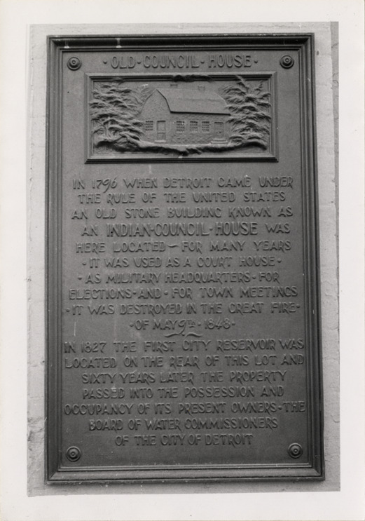 View of bronze tablet marking the site of the Old Council House, located on the southwest corner of Jefferson and Randolph. Inscription reads: "Old Council House. In 1796 when Detroit came under the rule of the United States an old stone building known as an Indian council house was here located, for many years it was used as a court house, as military headquarters for elections and for town meetings. It was destroyed in the Great Fire of May 9th 1848. In 1827, the first city reservoir was located on the rear of this lot and sixty years later the property passed into the possession and occupancy of its present owners the Board of Water Commissioners of the city of Detroit."