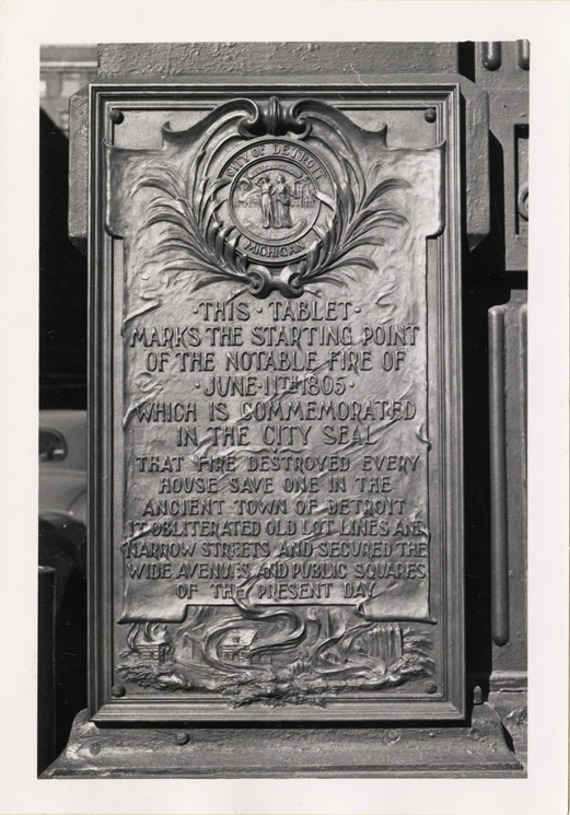 View of bronze tablet commemorating the Fire of 1805 in Detroit, installed at 220 West Jefferson between Shelby and Wayne. Inscription reads: "This tablet marks the starting point of the notable fire of June 11th 1805 which is commemorated in the City Seal. That fire destroyed every house save one in the ancient town of Detroit, it obliterated old lot lines and narrow streets and secured the wide avenues and public squares of the present day."