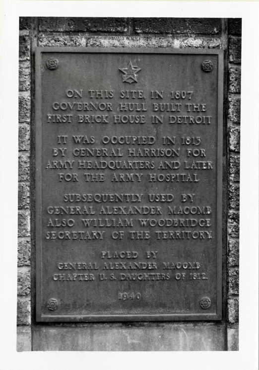 View of bronze tablet marking the site of the first brick house in Detroit, located on the Krolik Building on the southeast corner of Jefferson and Randolph. Inscription reads: "On this site in 1807 Governor Hull built the first brick house in Detroit. It was occupied in 1813 by General Harrison for Army headquarters and later for the Army hospital. Subsequently used by General Alexander Macomb, also William Wodobridge, Secretary of the Territory. Placed by General Alexander Macomb Chapter, U.S. Daughters of 1812, 1940."