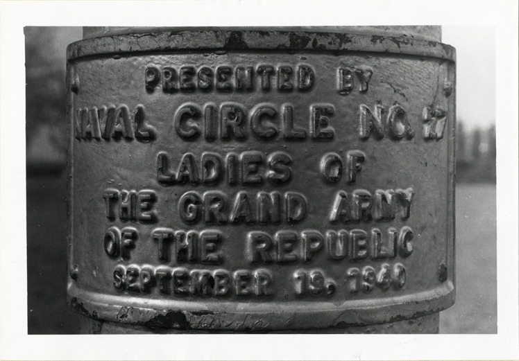 View of bronze tablet on flagpole dedicated to the Grand Army of the Republic, located on Belle Isle. Inscription reads: "Presented by Naval Circle no. 17, Ladies of the Grand Army of the Republic, September 19, 1940."