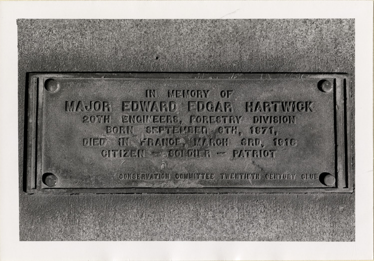 View of bronze tablet dedicated to Major Edward Edgar Hartwick, located at Roosevelt Park at Michigan and Sixteenth Street. Inscription reads: "In memory of Major Edward Edgar Hartwick, 20th Engineers, Forestry Division, born September 6th, 1871, died in France, March 3rd, 1916, citizen, soldier, patriot. Conservation Committee, Twentieth Century Club."