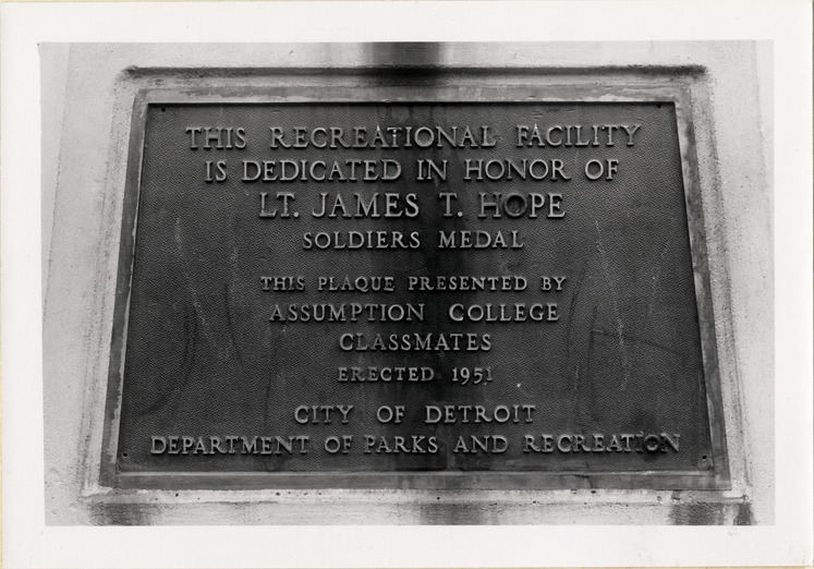 View of bronze tablet on flagpole dedicated to Lt. James T. Hope, located at the James T. Hope playground at Verne and Burgess. Inscription reads: "This recreational facility is dedicated in honor of Lt. James T. Hope, soldiers medal. This plaque presented by Assumption College classmates, erected 1951. City of Detroit, Department of Parks and Recreation."