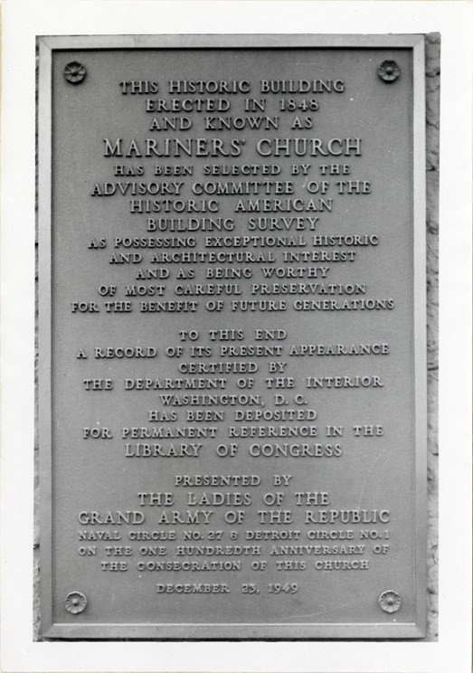 View of bronze tablet installed on front of Mariners' Church, located on the west side of Woodward between Jefferson and Woodbridge. Inscription reads: "This historic building erected in 1848 and known as Mariners' Church has been seleted by the Advisory Committee of the Historic American Buildings Survey as possessing exceptional historic and architectural interest and as being worthy of most careful preservation for the benefit of future generations. To this end a record of its present appearance certified by the Department of the Interior, Washington, D.C. has been deposited for permanent reference in the Library of Congress. Presented by the Ladies of the Grand Army of the Republic, Naval Circle no. 27 & Detroit Circle no. 1 on the one hundredth anniversary of the consecration of this church, December 23, 1949."