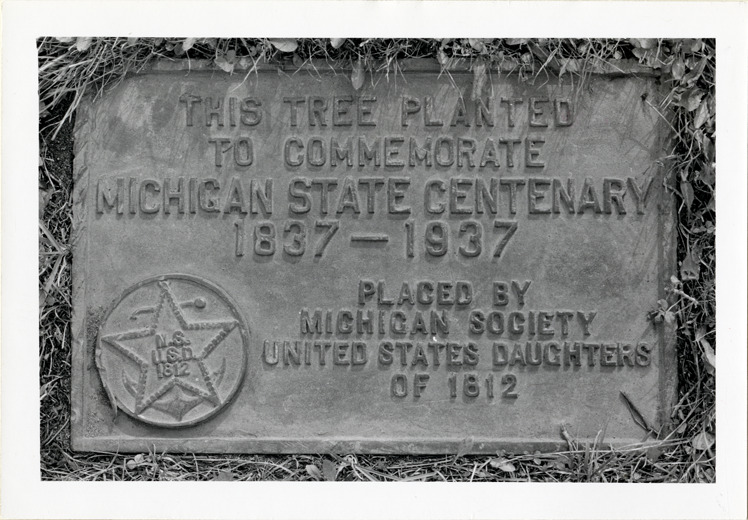 View of bronze tablet on tree commemorating the Michigan State Centenary, located on Belle Isle, on the south shore, east of Casino. Inscription reads: "This tree planted to commemorate Michigan State Centenary, 1837-1937, placed by Michigan Society, United States Daughters of 1812."