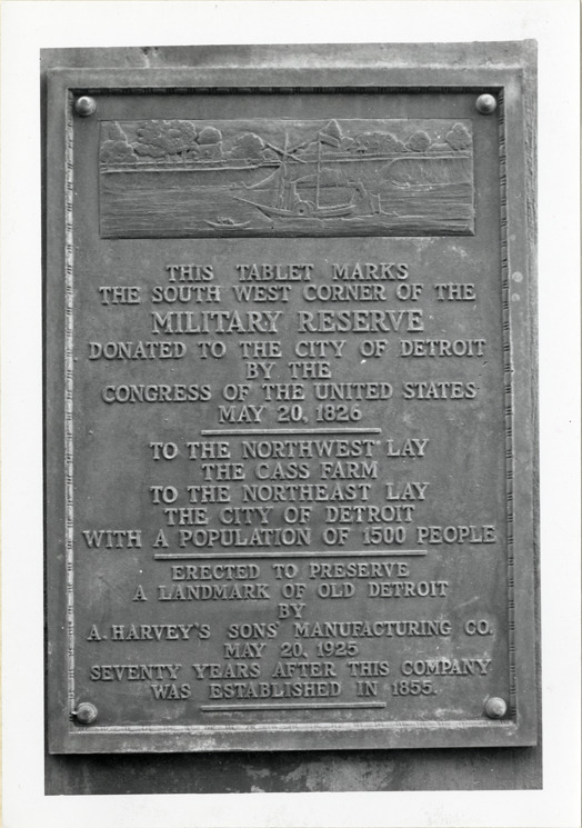 View of bronze tablet marking the site of the southwest corner of the Military Reserve, installed on the south side of Woodbridge between First and Cass. Inscription reads: "This tablet marks the south west corner of the Military Reserve donated to the City of Detroit by the Congress of the United States, May 20, 1826. To the northwest lay the Cass Farm, to the northeast lay the city of Detroit with a population of 1500 people. Erected to preserve a landmark of old Detroit by A. Harvey's Sons' Manufacturing Co., May 20, 1925, seventy years after this company was established in 1855."