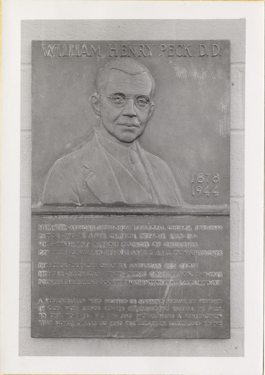 View of tablet dedicated to William Henry Peck, located on the outside wall of Peck Recreation Center at Brush and Kirby. William Henry Peck, D.D., 1878-1944. Minister, African Methodist Episcopal Church, 1892-1944. Pastor, Bethel A.M.E. Church, Detroit, 1928-1944. Vice-President, Detroit Council of Churches. Compiler, combined hymnal A.M.E. & A.M.E. Zion Churches. Director, Detroit Chapter American Red Cross. Member, Michigan State Crime Commission, 1941-1943. Founder & President, Booker T. Washington Trade Assn., 1930-1939. A humanitarian who believed in mankind because he believed in God. With hands always stretched to inspire, to help, to lift, to save. His life and works were a benediction that moved others to find the secret of victorious living."