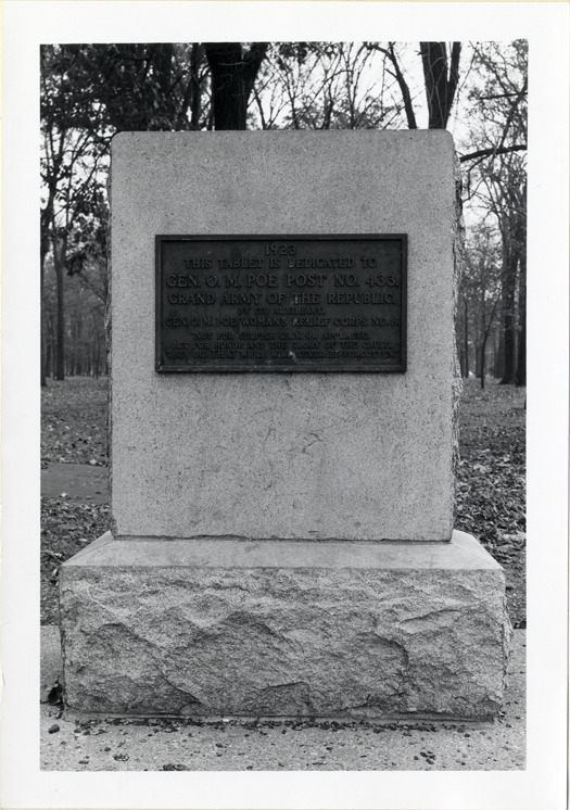 View of bronze tablet dedicated to General O.M. Poe Post no. 433 located on Belle Isle on Central Avenue near Picnic Way. Inscription reads: "1923, this tablet is dedicated to Gen. O.M. Poe Post no. 433, Grand Army of the Republic, by its auxiliary, Gen. O.M. Woman's Relief Corps no. 8. Not for selfish gain or applause, but for honor and the glory of the cause, they did that which will never be forgotten."