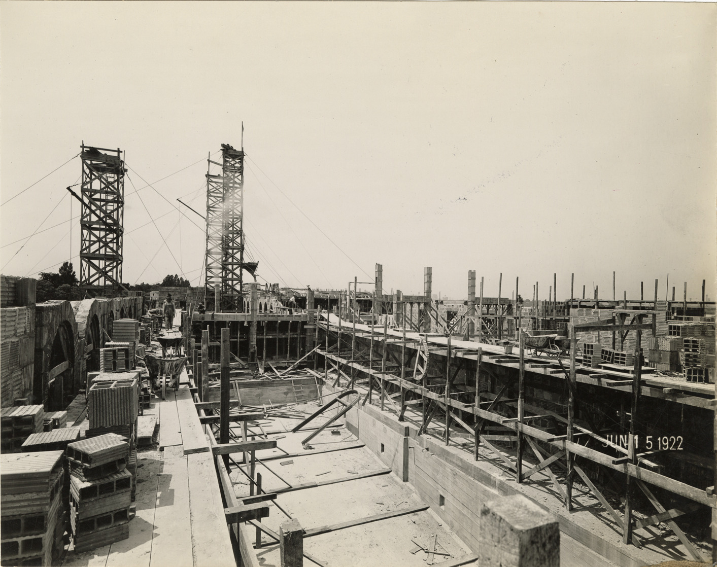 View of the Detroit Yacht Club during construction. Printed on front: "Jun 15, 1922." Stamped on back: "Godfrey and Grossman, commercial photographers. Fort Street West, Detroit."