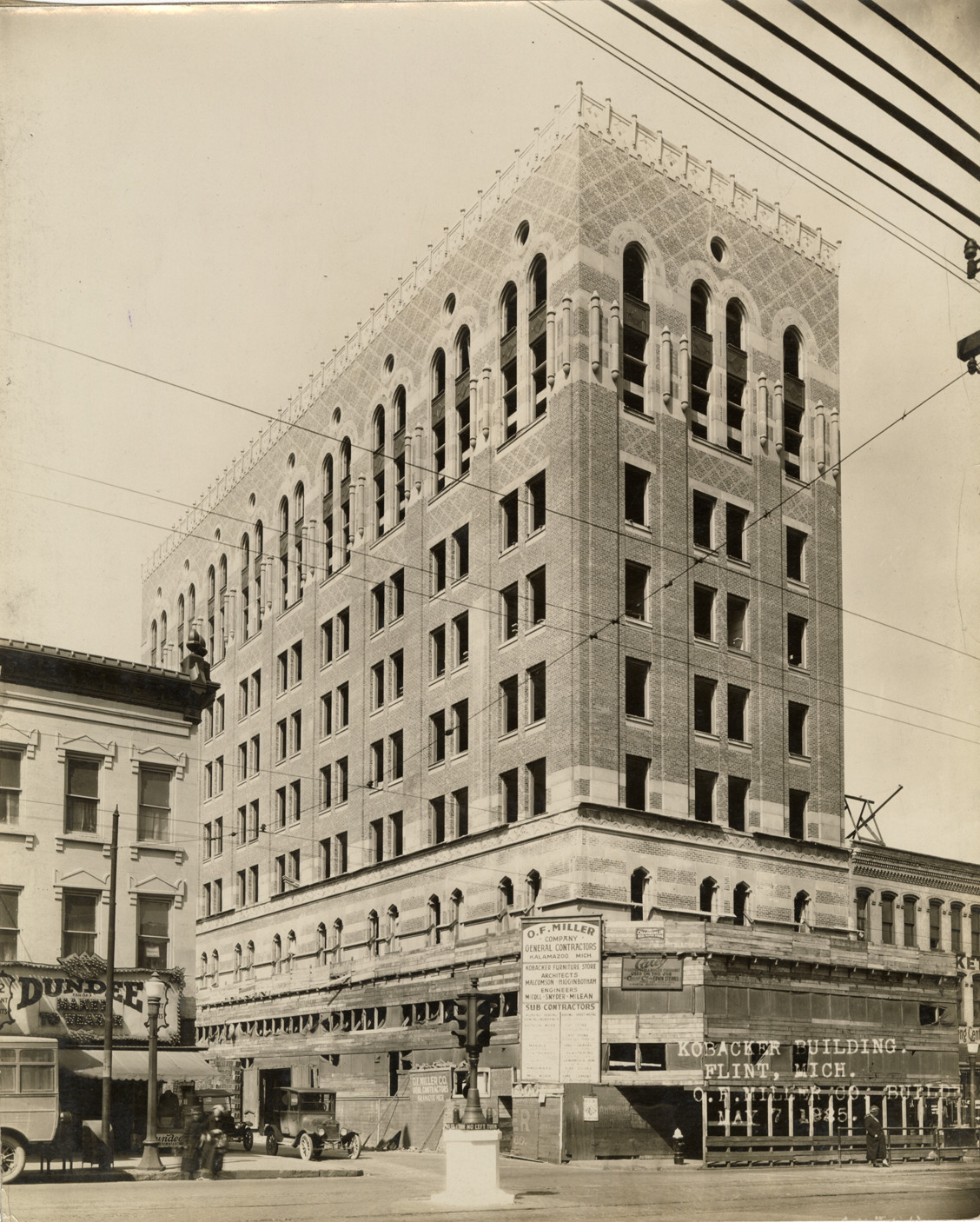 View of the Kobacker furniture store in Flint, Michigan during construction. Sign in front of building reads: "O.F. Miller Company, general contractors, Kalamazoo, Michigan. Kobacker furniture store. Architects, Malcomson Higginbotham. Engineers, McColl, Snyder, McLean." Printed on front: "Kobacker building, Flint, Mich. O.F. Miller Co. builders, May 7, 1925." Handwritten on back: "Kobacker furniture store bldg. nearing completion, Flint, Michigan. Malcomson & Higginbotham, architects."
