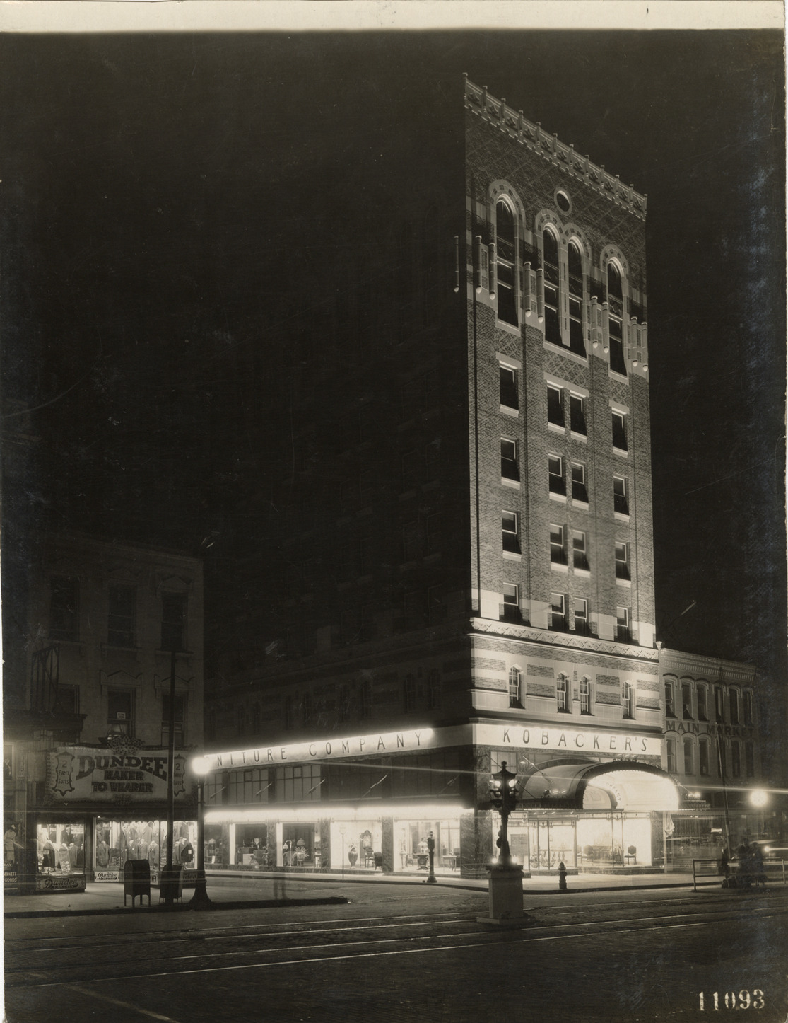 Nighttime view of the Kobacker furniture store in Flint, Michigan. Lighted sign on building reads: "Kobacker's Furniture Company." Handwritten on back: "Kobacker's store, Flint, Mich. Malcomson & Higginbotham, architects."