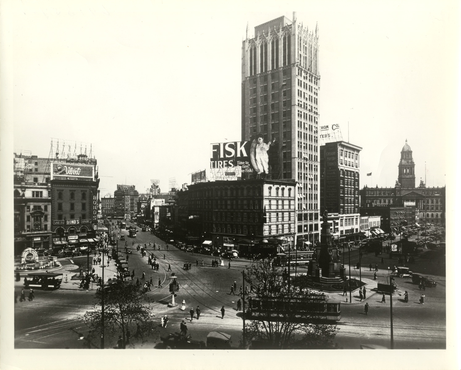 Favorite this☆ Campus Martius Description: View of Campus Martius with Soldiers' and Sailors Monument in foreground. Billboard for Fisk tires on commercial building; City Hall in background. Handwritten on back: "ca. 1910." Details Resource ID: bh009292 Subject: Streets--Michigan--Detroit Plazas--Michigan--Detroit Soldiers' monuments--Michigan--Detroit Photographic prints Date Issued: 1910 (year approximate) Format: 1 photographic print ; 8 x 10 in. Member of: Burton Historical Collection Filing Location: D/Streets-Campus Martius Rights: Physical rights are retained by DPL. Copyright is retained in accordance with U.S. copyright laws.