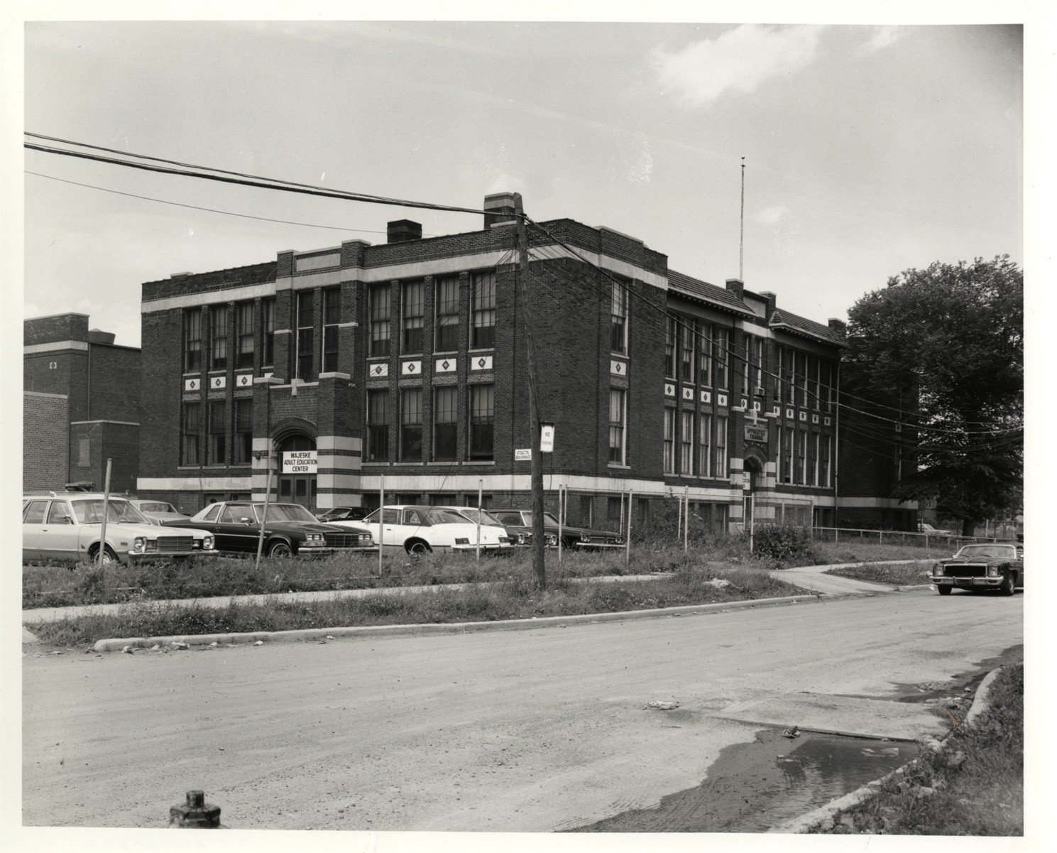 View of Majeske Open Air School and parking lot. Signs over entrances: "Majeske Adult Education Center" and "Apprentice training." Stamped on back: "Photography by M.M.I. Productions (Division of Marie Mason, Inc.) 19136 Woodward Ave., Detroit, MI 48203. Telephone 313/368-2800." Handwritten on back: "Majeske School, N.W. 6/8/81."