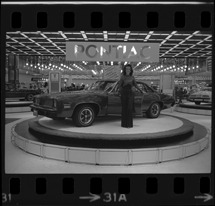 View of a woman, wearing a long dress, standing next to Pontiac car on a circular platform at the Detroit Auto Show. "Pontiac" sign displayed in background.