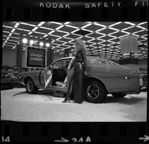 View of Miss Michigan 1973, wearing a crown and long dress, standing next to Dodge Charger car on a circular platform at the Detroit Auto Show. "Dodge Charger" sign displayed in background.