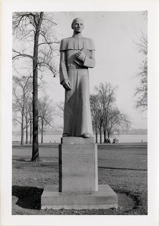 View of Father Gabriel Richard statue located in Gabriel Richard Park at East Jefferson and East Grand Boulevard. Inscription reads: "Father Gabriel Richard, 1767-1932. Pioneer, priest, patriot, founder of churches and schools, co-founder of the university of Michigan, member of Congress, printer, martyr of charity, prophet and apostle of Christian civilization. He served God and country on the Michigan frontier."
