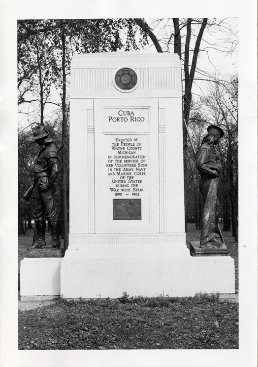 View of Spanish-American War and Philippine Insurrection monument on Belle Isle. Bronze statue of soldier on granite base on the west side of monument; bronze statue of a sailor on east side of monument. Inscription reads: "Cuba, Porto Rico, erected by the people of Wayne County, Michigan in commemoration of the service of her volunteer sons in the Army, Navy and Marine Corps of the United States during the War with Spain, 1898-1902. China, Philippines, in commemoration of the volunteer services of Wayne County's sons during the Insurrection in the Philippines and the Chinese Relief Expedition, 1898-1902." The monument was designed by the Lloyd Bros. Co. and the statues executed by Allen G. Newman.