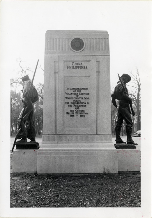 View of Spanish-American War and Philippine Insurrection monument on Belle Isle. Bronze statue of soldier on granite base on the west side of monument; bronze statue of a sailor on east side of monument. Inscription reads: "Cuba, Porto Rico, erected by the people of Wayne County, Michigan in commemoration of the service of her volunteer sons in the Army, Navy and Marine Corps of the United States during the War with Spain, 1898-1902. China, Philippines, in commemoration of the volunteer services of Wayne County's sons during the Insurrection in the Philippines and the Chinese Relief Expedition, 1898-1902." The monument was designed by the Lloyd Bros. Co. and the statues executed by Allen G. Newman.