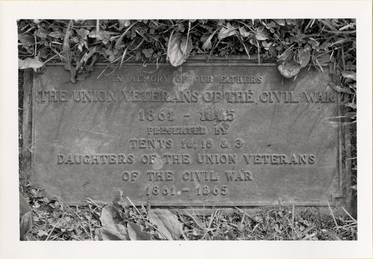 View of bronze tablet honoring the Union Veterans of Civil War located on Belle Isle, on south shore east of Casino. Inscription reads: "In memory of our fathers, the Union Veterans of the Civil War, 1861-1865, presented by Tents 16, 18 & 3, Daughters of the Union Veterans of the Civil War, 1861-1865."