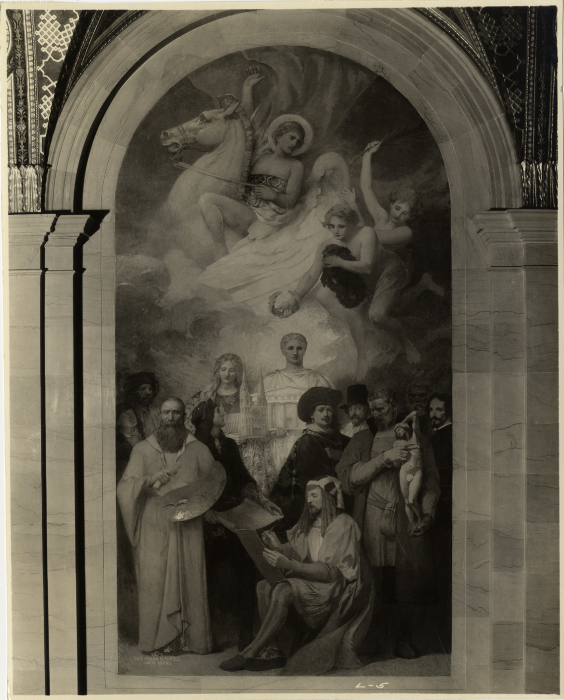 View of mural by Edwin Howland Blashfield, depicting an allegory of the graphic arts, displayed on the third floor of the Main Library, Detroit Public Library. Typed on back: "Blashfield mural - Graphic Arts." Stamped on back: "L.S. Glover, commercial photographer, 7449 Hanover Ave., Detroit."