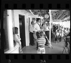 View of two children watching trumpeter, drummer and saxophone player in band on the ferry en route to Bob-Lo Amusement Park and Bob-Lo Island. Passengers in background.