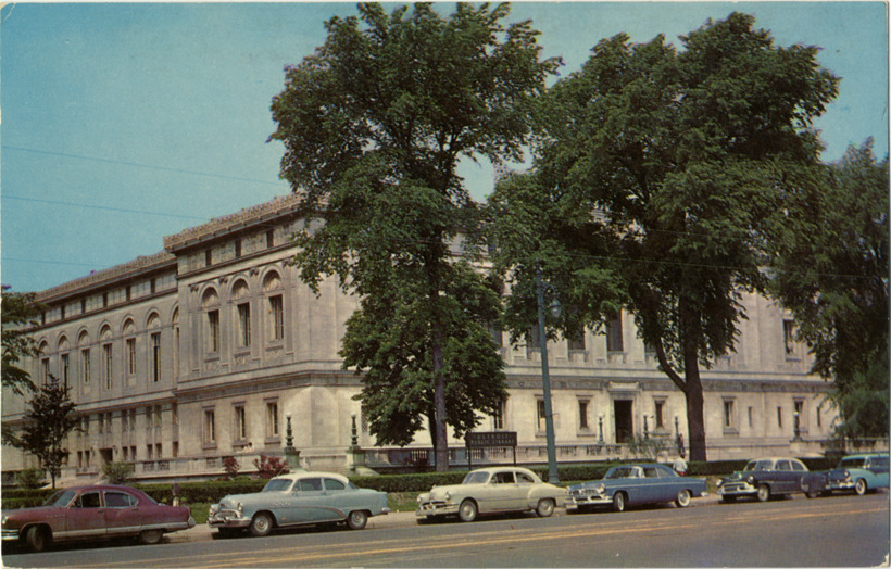 View of the Detroit Public Library located on Woodward Avenue, with automobiles parked in street. Italian Renaissance style building was designed by Cass Gilbert. Printed on back: "Detroit Public Library, Woodward Avenue. Built of Vermont marble in Italian Renaissance style, is a part of the Art Center, Detroit, Michigan. Pub. by Chaffee & Co., Inc., Detroit, Mich. Lusterchrome, reg. U.S. Pat. Off. Made only by Tichnor Bros., Inc., Boston 15, Mass."