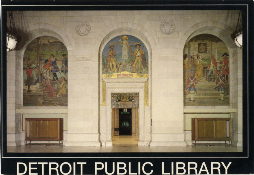 View of murals depicting the landing of Cadillac's wife at Detroit, the conspiracy of Pontiac and an allegorical painting of the Northwest by Gari Melchers; murals are located in Adam Strohm Hall at the Detroit Public Library. Printed on front: "Detroit Public Library." Printed on back: "Detroit Public Library, Detroit, Michigan. Murals by Gari Melchers in the 3rd floor exhibit hall of the Main Detroit Public Library, 5201 Woodward Avenue. (Left to right) 'The landing of Cadillac's wife,' 'The spirit of the Northwest,' 'The conspiracy of Pontiac.' Photo by John Penrod. [copyright] Penrod/Hiawatha Co., Berrien Center, Michigan 49102, phone 616-461-6993."