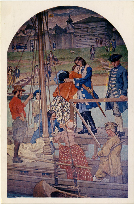 Mural by Gari Melchers depicting Cadillac embracing his wife on wharf at Detroit, located in Adam Strohm Hall at the Detroit Public Library. Ship with Madame Tonty in foreground; soldiers and fort in background. Printed on back: "The Detroit Public Library, 5201 Woodward Avenue, Detroit 2, Michigan. Landing of Cadillac's wife, a mural by Gari Melchers (1860-1932) in Adam Strohm Hall, Main Library. Lithocolor Division, Microfilms, Inc. Ann Arbor, Michigan."