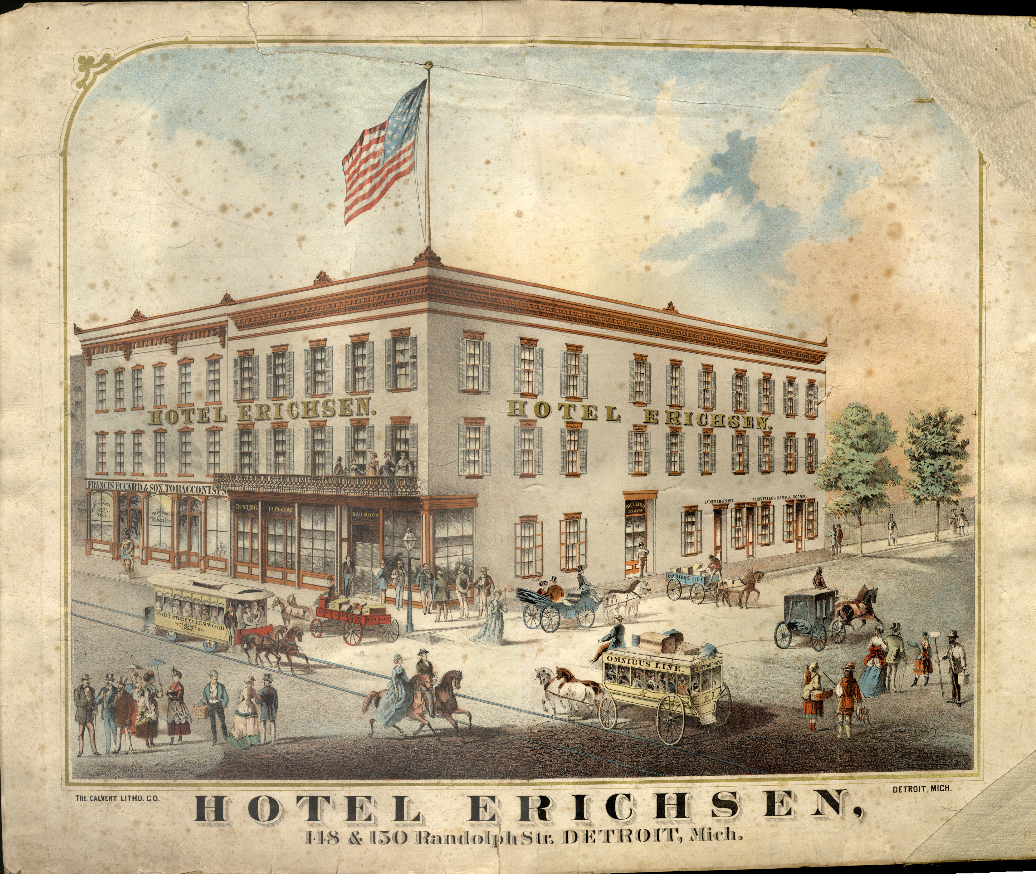 Lithograph depicting the Hotel Erichsen. Streetcar, horse-drawn vehicles and pedestrians in foreground. Printed on front: "Hotel Erichsen, 148 & 150 Randolph Str., Detroit, Mich. The Calvert Litho. Co., Detroit, Mich." Handwritten on back: "Hotel Erichsen at Randolph & Fort NE in 1868. This is one of the first lithographs made by the Calvert Co. The Hotel was run by Claus D. Erichsen. Composition of picture shows great variety of dress of period, including one-lunged bustles. Distance at extreme right and two-lunged foreground at right. The ladies then swept the streets with their skirts and carried home the accumulation. Shorter walking skirts were only worn by the hard-boiled types of women. Riding habits were an embarassment to the horse which sometimes stepped on them. Vehicles show street car, omnibus, private carriage hack and two types of express wagon. Gas street lamp at corner. Old fashioned trunk and valise on omnibus. Plug hats were the rule instead of the exception. At the extreme right foreground a former slave turned whitewash artist. Nearby an Indian with bow and arrows with a string of whitefish for sale. His squaw with a pappoose [sic] on her back peddles bead moccasins with porcupine quill ornament. At extreme left a wooden Indian offering cigars, carved by Julius Melchers, Detroit's leading sculptor, who also carved statues on the City Hall. Hotel equipped with all the luxuries and conveniences of the time -- barroom, dining room, billiard room, ladies entrance and travellers' sample room. Original lithograph printed on colors. Old Erichsen Hotel diagonally across street from site of Wayne Count building. Evidently all Detroiters were people of leisure for where is the regiment in overalls and the tin pail brigade which helped to put Detroit on the map? But one thing is as it used to be. Streetcars and busses are still jammed. Public hack has a picture of Pharaoh's Horses on its rear."