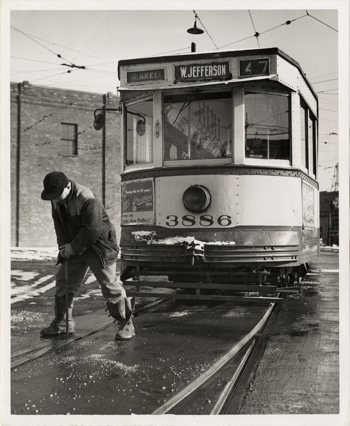 Favorite this☆ Man fixing tracks in front of West Jefferson-Fenkell streetcar no. 47 Description: View of man fixing tracks in front of West Jefferson-Fenkell streetcar no. 47. Handwritten on back: "Feb. 9, 1954." Details Resource ID: bh009462 Subject: Cable cars (Streetcars)--Michigan--Detroit Street-railroad tracks--Maintenance and repair Photographic prints Date Issued: 1954-02-09 Format: 1 photographic print ; 10 x 8.25 in. Member of: Burton Historical Collection Filing Location: D/Street cars Rights: Physical rights are retained by DPL. Copyright is retained in accordance with U.S. copyright laws.