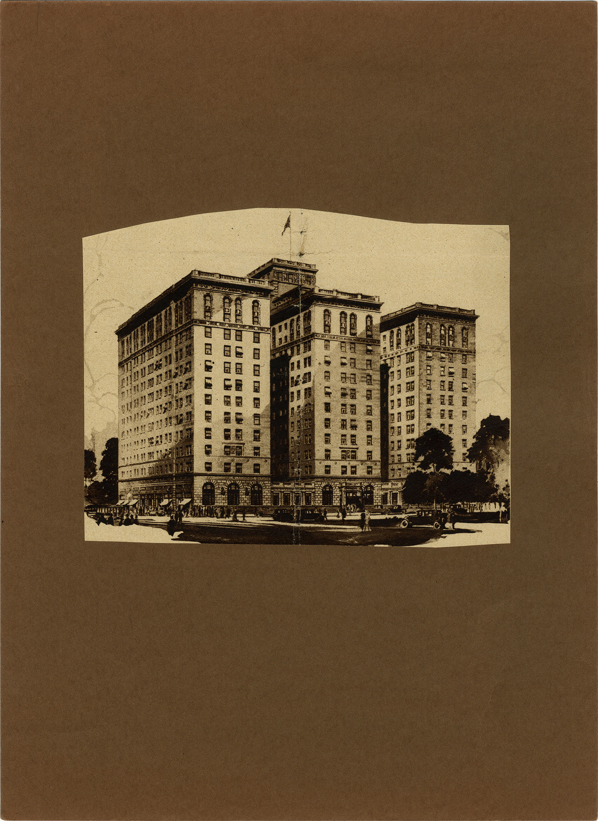 View of Wardell Hotel, located on Kirby Street. Label on back: "Nowhere in Detroit can be found a finer location than The Wardell's -- directly opposite the beautiful Art Center, only 10 minutes from downtown, with transportation of all kinds right on hand." Handwritten on back: "Detroit Wardell Hotel. F. 10-3-26."