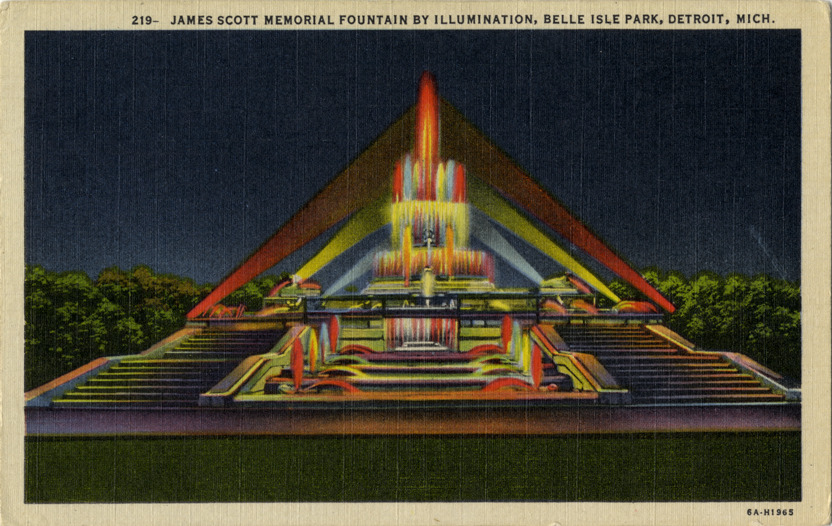 Nighttime view of the James Scott Memorial Fountain on Belle Isle. Printed on front: "219, James Scott Memorial Fountain by illumination, Belle Isle Park, Detroit, Mich." Printed on back: "The James Scott Memorial Fountain, Belle Isle, was erected at a cost of $500,000. The fountain consists of four basins, with aquatic figures forming the art work in the center. All during the summer season, the fountain is illuminated after dark through the use of a four-color light scheme. United News Co., 24 West Jefferson Avenue, Detroit, Mich. Genuine Curteich-Chicago 'C.T. Colortone' postcar (reg. U.S. Pat. Off.)"