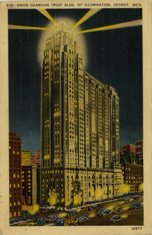 Nighttime view of Union Guardian Trust Building. Automobiles on street in foreground. Printed on front: "638, Union Guardian Trust Bldg. by illumination, Detroit, Mich." Printed on back: "Metrocraft, Everett, Mass. Made by Metropolitan, Everett, Mass. Pub. by United News Co., Detroit, Mich." Handwritten on back: "Good morning, Sis. I wonder if your [sic] up yet, it's 8:00. Just think you can sleep long tomorrow morning. What do you know we went for a walk last night at 11:45 p.m. My mother-in-law and May and I. Boy we went shopping yesterday in these big stores there [sic] nothing like ours. I'll write tomorrow. Love, Irene." Card is postmarked August, 1943.