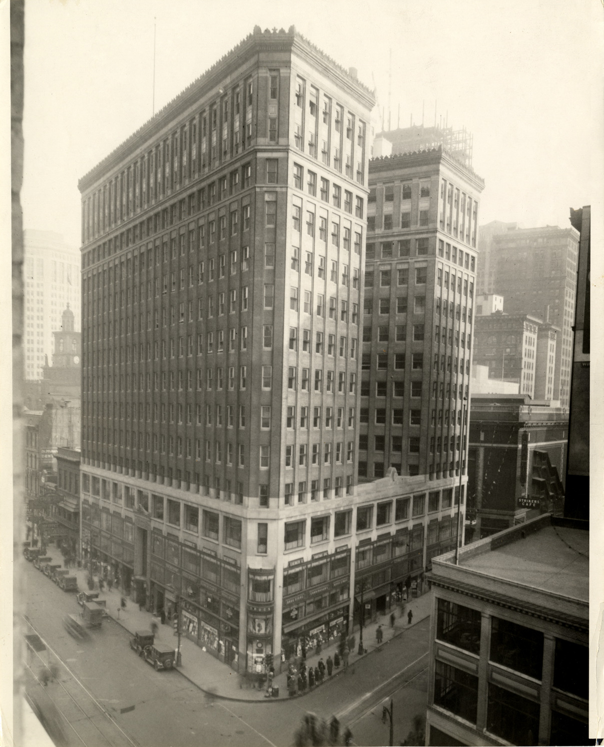 View of the Lafayette Building, also known as the Michigan Lafayette Building, bordered by Lafayette Boulevard, Michigan Avenue and Shelby Street. Lafayette Building was designed by architect C. Howard Crane. Handwritten on back: "Lafayette Bldg., Mich., Shelby."