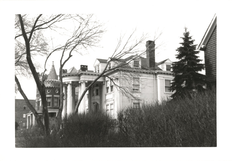 Side view of two-story, wooden-frame Neoclassical style house located on Parkview Ave. in Detroit. House has full-height entry porch supported by Ionic columns. Brick house in background has turret. Handwritten on back: "Parkview Ave., May 3, 1965, by Aldo Giglio, 3800 McDougall."