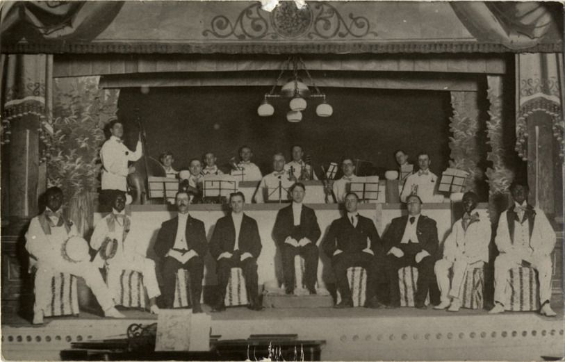 View of nine men and orchestra posing on stage for fundraising event in Clare, Michigan. Handwritten on back: "Remember how we built the Clare City Park, good old days of the past, 1906."
