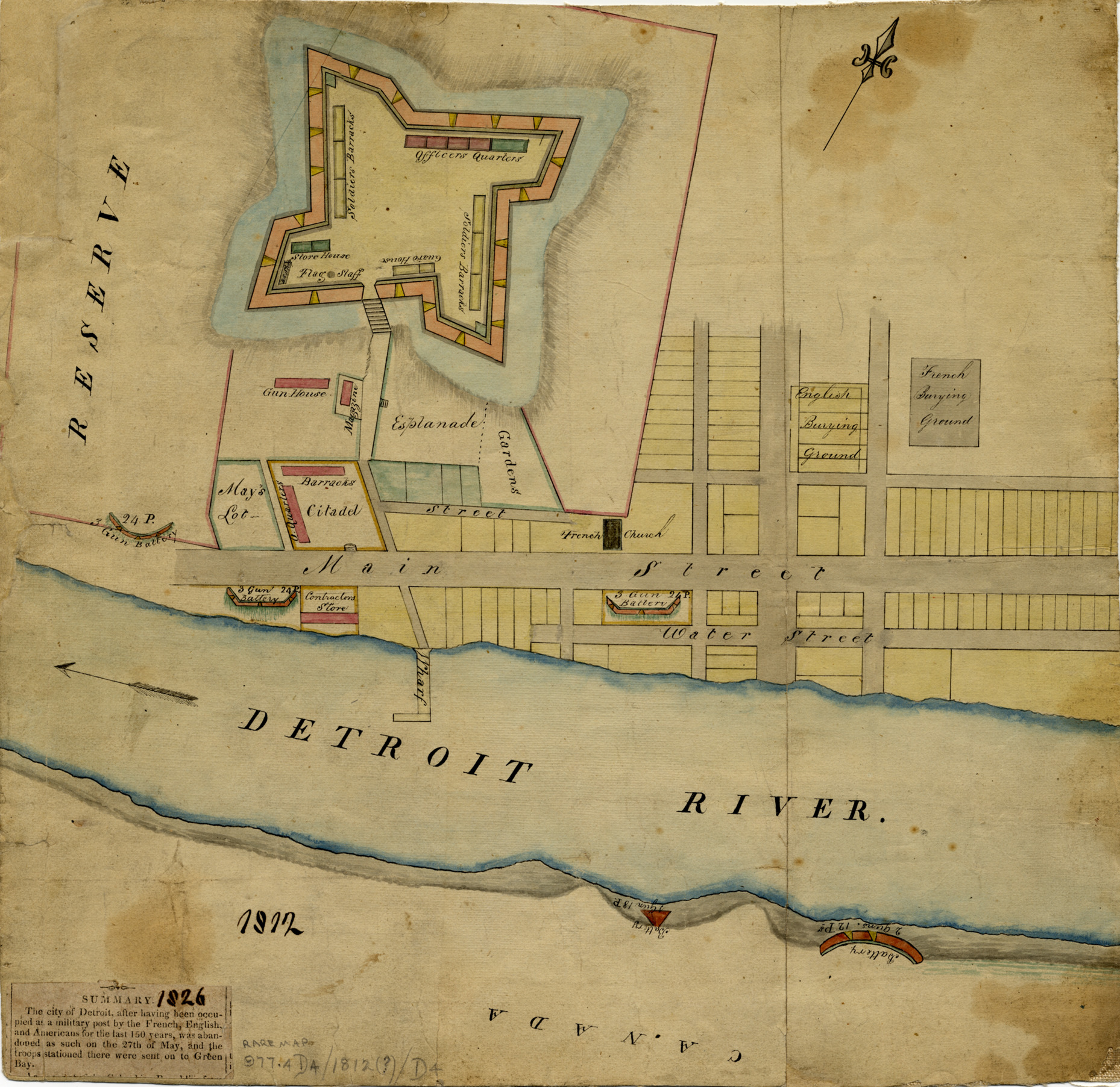Map of Detroit showing streets, Detroit River, Fort Lernoult, batteries and burial grounds. Label on front: "Summary. The city of Detroit, after having been occupied at a military post by the French, English, and Americans for the last 150 years, was abandoned as such on the 27th of May, and the troops stationed there were send on to Green Bay."