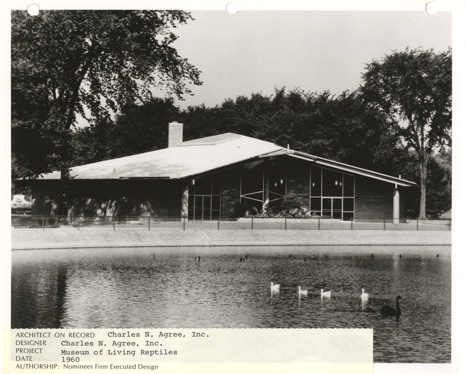 View of Holden Museum of Living Reptiles at the Detroit Zoo, designed by Charles N. Agree. Printed on front: "Architect on record: Charles N. Agree, Inc.; Designer: Charles N. Agree, Inc.; Project: Museum of Living Reptiles; Date: 1960; Authorship: Nominees Firm Executed Design."