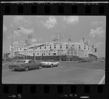 View of Tiger Stadium. Cars wait at traffic light in foreground.