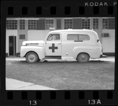 View of ambulance at Bob-Lo Amusement Park, parked in front of building.