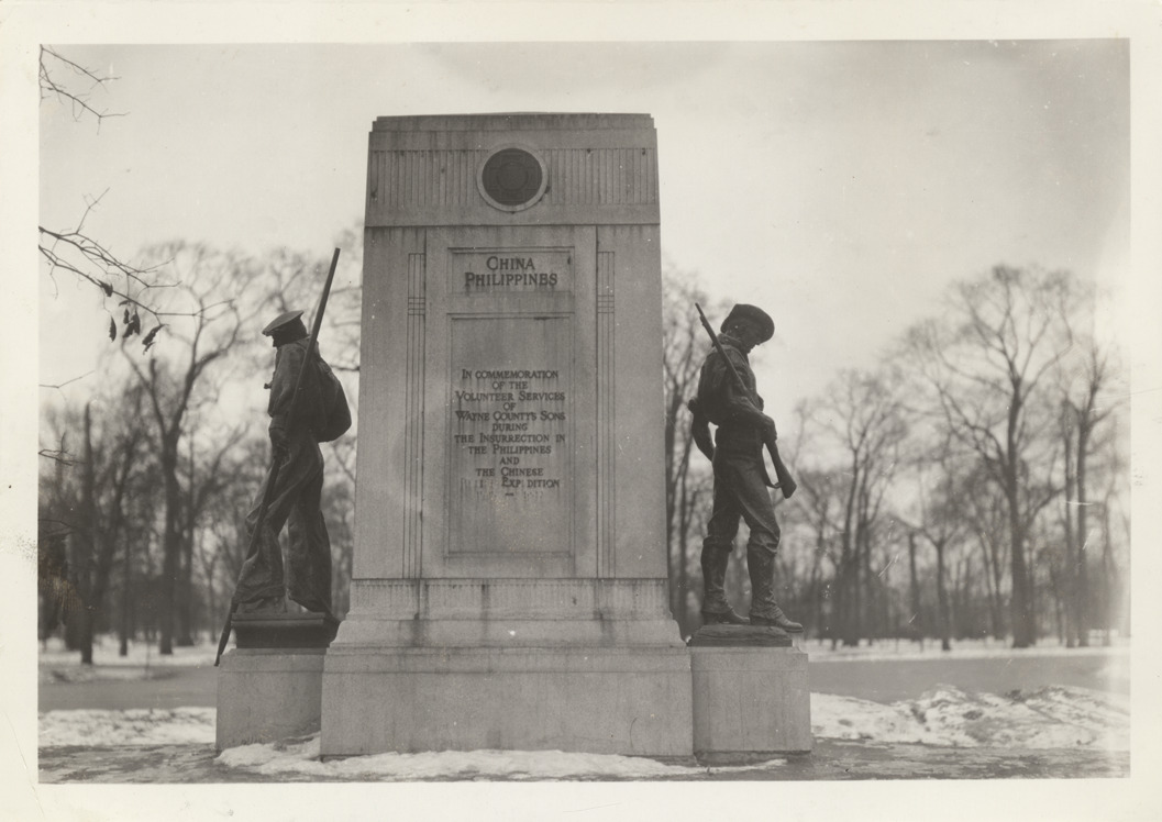View of Spanish-American War and Philippine Insurrection monument on Belle Isle. Bronze statue of soldier on granite base on the west side of monument; bronze statue of a sailor on east side of monument. Inscription reads: "Cuba, Porto Rico, erected by the people of Wayne County, Michigan in commemoration of the service of her volunteer sons in the Army, Navy and Marine Corps of the United States during the War with Spain, 1898-1902. China, Philippines, in commemoration of the volunteer services of Wayne County's sons during the Insurrection in the Philippines and the Chinese Relief Expedition, 1898-1902." The monument was designed by the Lloyd Bros. Co. and the statues executed by Allen G. Newman. Handwritten on back: "1-16-36."