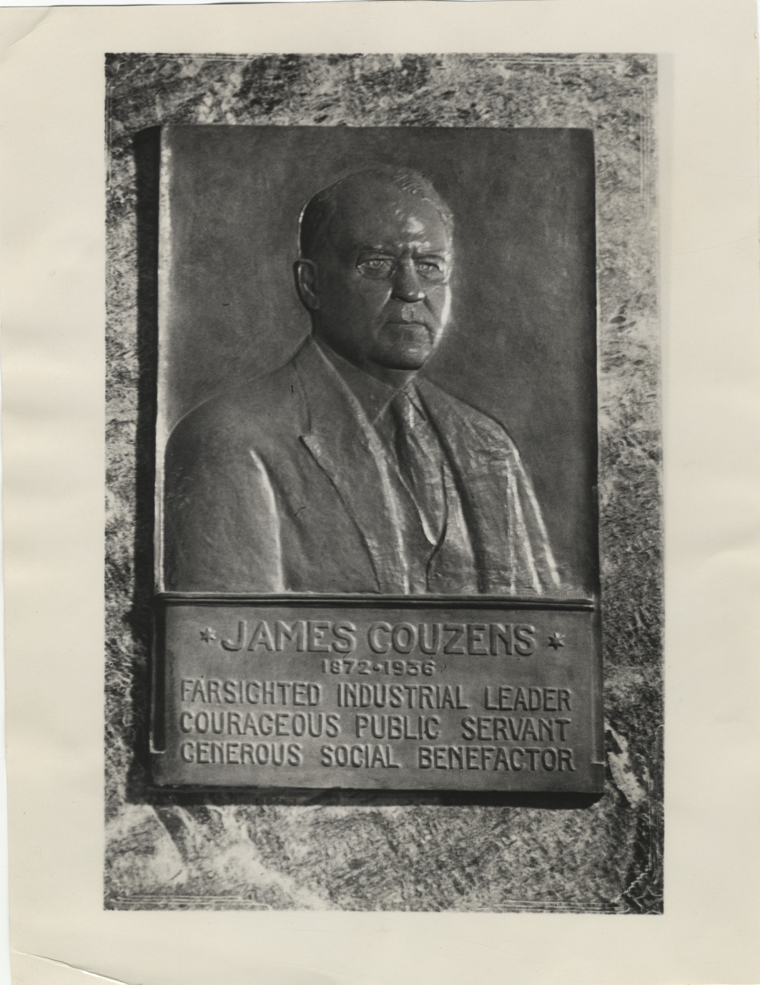 Bronze plaque commemorating James Couzens, located in niche at Woodward Avenue entrance to City Hall. Plaque was designed by Samuel Cashwan. Inscribed on plaque: "James Couzens, 1872-1936. Farsighted industrial leader, courageous public servant, generous social benefactor."