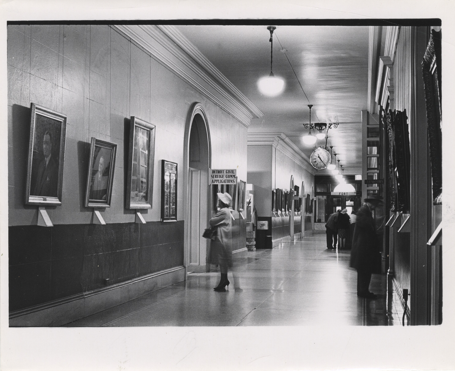 View of woman looking at building directory of first floor of Detroit City Hall. Hallway is decorated framed paintings; clock is suspended from ceiling. "Detroit Civil Service Comm. applications" sign next to doorway. Handwritten on back: "Photo by Wiedelman. Detroit Old City Hall. 1st floor at Old City Hall."