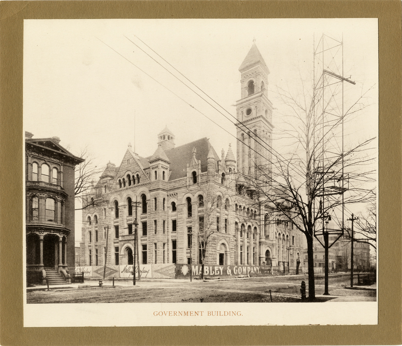 View of Detroit Post Office. Richardsonian Romanesque building has tower. Fence with Mabley & Company advertisements surrounds building. Printed on front: "Government building." Handwritten on back: "In: L977.4D4 H71, Holden, E.G., Artwork of the story of Detroit."